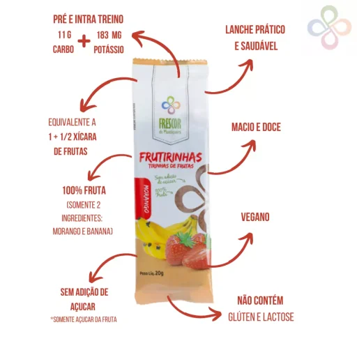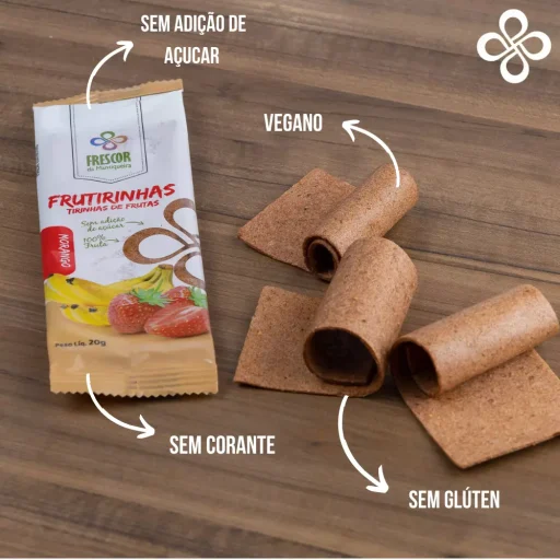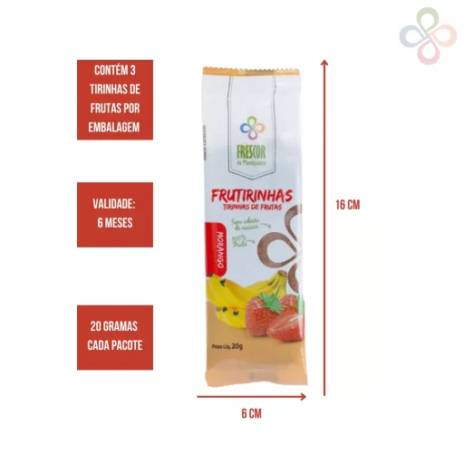 As Frutirinhas, tirinhas de frutas desidratadas, é um doce delicioso e nutritivo. É 100% natural, feito somente com frutas desidratadas à baixa temperatura, mantendo todos os nutrientes dos alimentos.